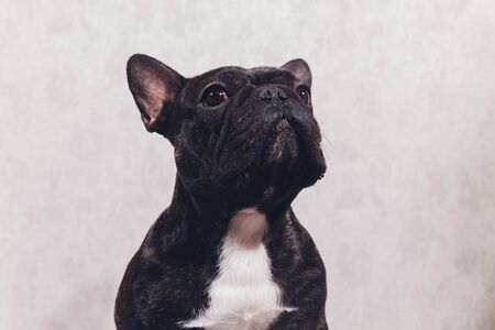 A close-up studio portrait of a brindle French Bulldog with an attentive and hopeful expression. The dog looks upward against a clean gray background, capturing a moment of quiet curiosity and unwavering loyalty. This image is perfect for themes of companionship, pet care, and devotion.