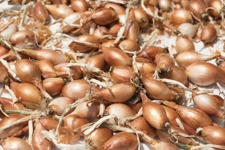 Pile of young onion bulbs ready for planting.