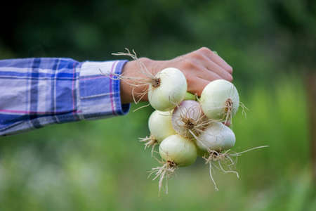 Bunch of fresh onions in the hands of a farmer.