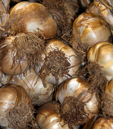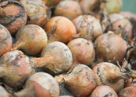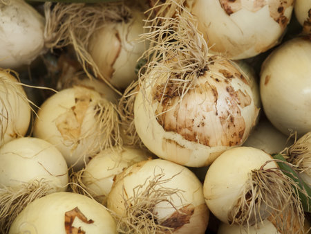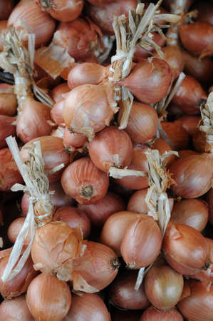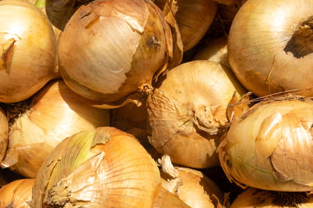Composition of onions placed in a street food market. Background image of fresh food