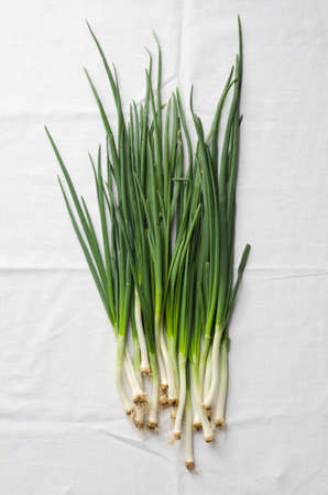 Spring onions over white cloth, above view
