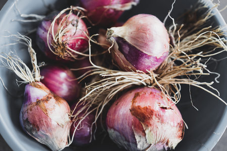 simple food ingredients concept, fresh red spanish onions just harvested from veggie patch with roots and dirt still on them