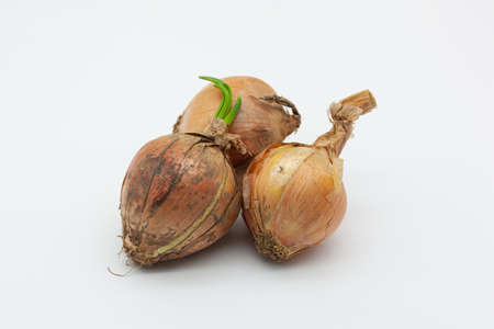 Shallots are sprouting young leaves isolated on a white background.