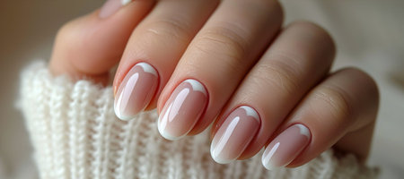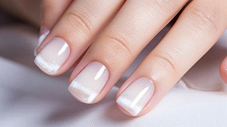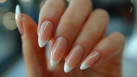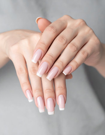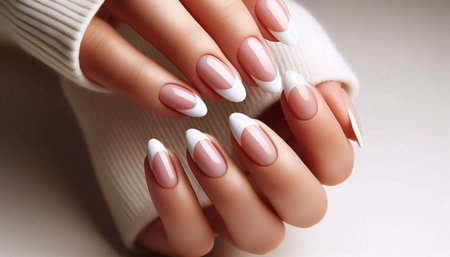 A close-up of a woman's hands showing a contemporary French manicure with crisp, defined white tips and a neutral base, emphasizing a modern style. High quality photo