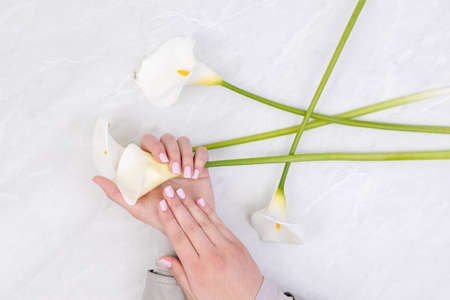 Beautiful nails on woman hands with white calla flowers.