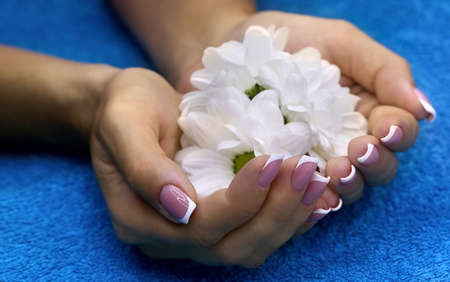 Classic french manicure and white flowers on the blue towel