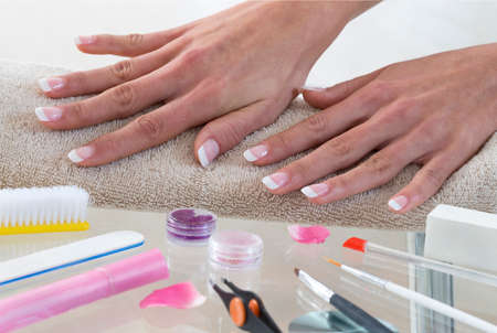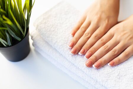 Hands of young woman with french manicure on the towel