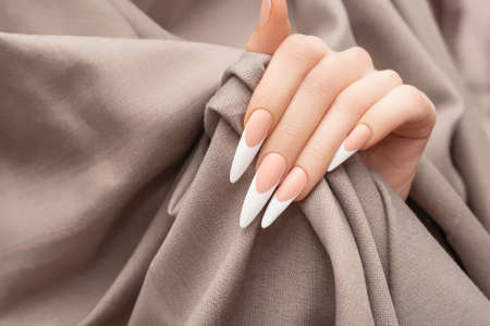 Female hand with long french nail design. Long french nail polish manicure. Woman hand on beige fabric background