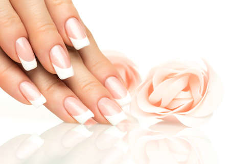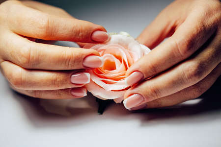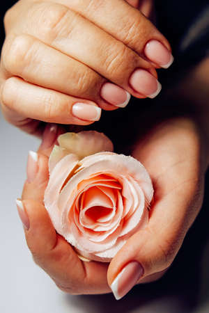 Beautiful female hand with french manicure on rose flower. Manicure salon