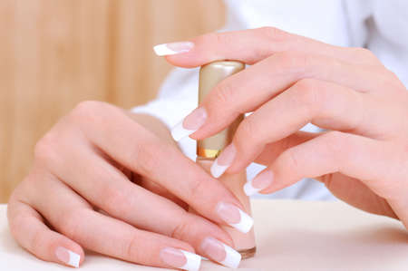 Beautiful female hands with beauty french manicure holding bottle enamel
