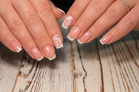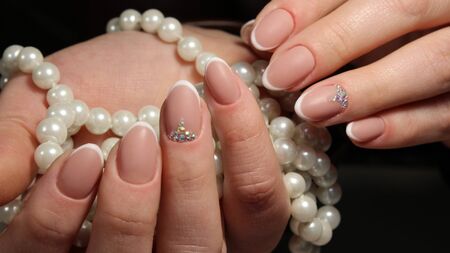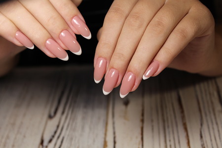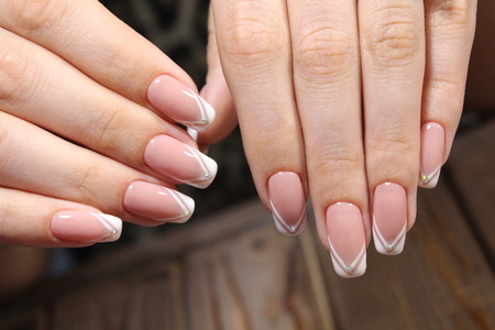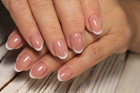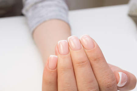 Beautiful womans nails with french manicure, in beauty studio