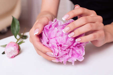 Woman hands with beautiful french manicure nails and peonies flowers