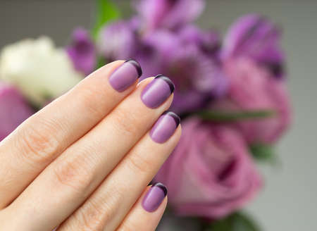 French classic manicure. Female fingers with beautiful nails on lavender background, close-up, selective focus. Spa concept, skin care, beauty treatments, salon and beautiful woman