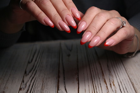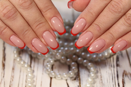 beautiful red French manicure on a trendy texture background