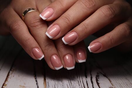 A magnificent French manicure. Transparent nail polish. Close-up photo of hands. Women's hands on a simple background.