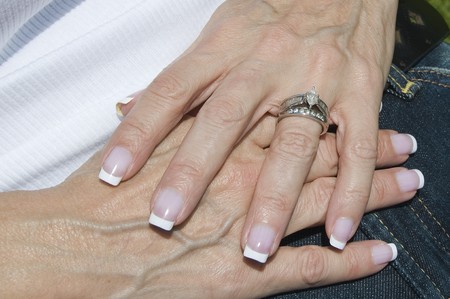 Well manicured female hands with wedding band and engagement ring
