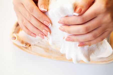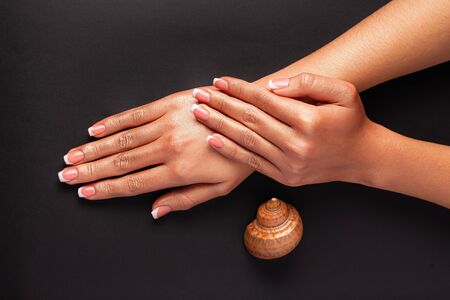 French manicure gel polish. Strong and healthy nails concept. Beautiful female hands on a black background with a cockleshell.