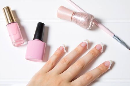 A woman glues stickers on her nails for French manicure. The girl applies nail Polish. Nail care. Nail salon, procedure, SPA. Home nail care. Manicure tools. Beauty, lifestyle, Glamour.