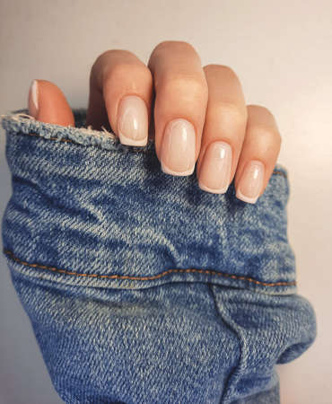 Gentle camouflage gel polish on square nails with a French design. Hands with a professional manicure in a denim jacket. Trendy nail coating with French design.