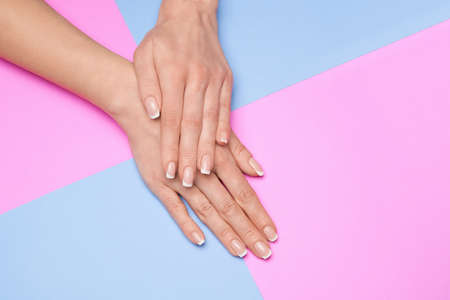 Beautiful Female Hands with French manicure over colorful paper background
