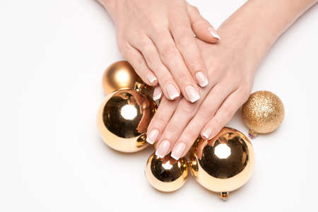 Beautiful Female well-groomed Hands with French manicure and new year decoration balls over light background