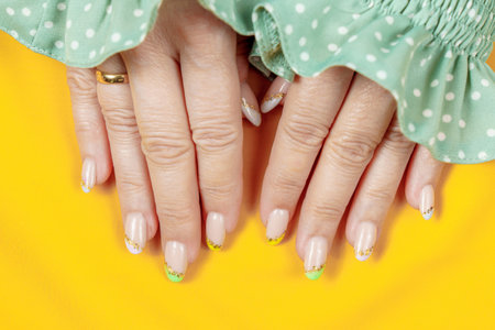 Female hands with beautiful manicure on yellow background. Manicure design.
