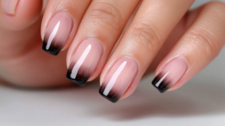 This image showcases an elegant nail art design featuring an ombre effect with shades of pink and black. The perfect choice for stylish and fashionable hands.