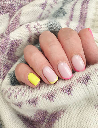 Camouflage gel nail polish with French design in yellow and pink. Professional manicure with color design. Trendy nail coating with French design.