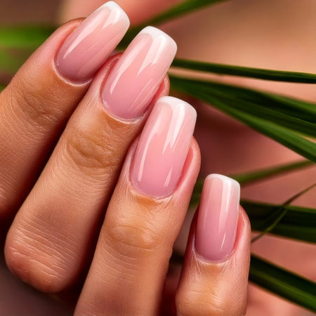 Generated imageClose-up of female hand with light pink, elegant square-shaped nails. Clean and stylish manicure. High quality photo