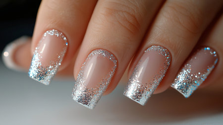 A close-up of beautifully polished nails showcasing a silver glitter gradient design. The manicure displays a neat finish with a blend of shimmer and natural nail color, focusing on aesthetics.