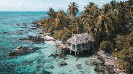 This captivating image captures a serene beach house nestled on a tranquil island, surrounded by vibrant palm trees and inviting turquoise waters.