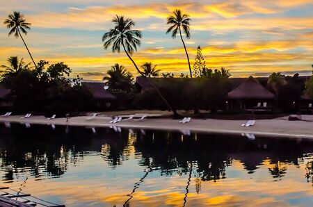 Quiet and calm lagoon on the island with crystal clear, azure water bungalows over the water and palm trees