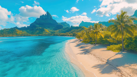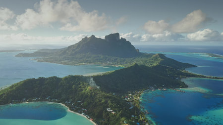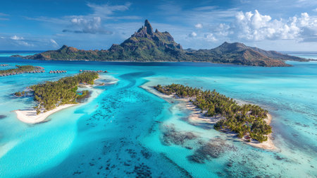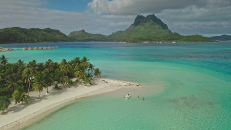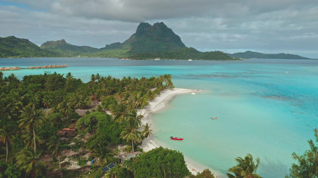 Stunning drone revealing the idyllic beauty of Bora Bora, featuring crystal-clear turquoise waters, pristine white sand beaches, and lush tropical vegetation. Travel tropical vacation concept