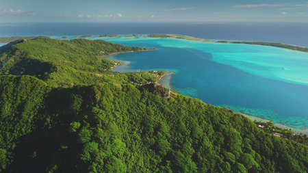 Tropical green mountain Bora Bora island, aerial view. Drone fly over forest coastline with turquoise water, showcasing beauty and tranquility of exotic wild nature. Summer luxury travel background