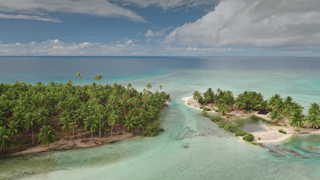 Aerial view top down small tropical island with palm trees and white sand beach surrounded by turquoise ocean water and coral reef. Remote wild nature paradise, exotic summer luxury travel. Drone shot