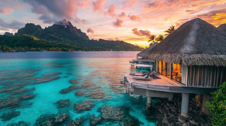 Experience the beauty of a luxury bungalow on clear waters at sunset. Surrounded by stunning landscapes, this serene destination offers the perfect escape for travelers.