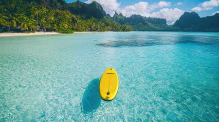 A bright yellow SUP board drifting on crystal-clear turquoise waters, surrounded by lush tropical islands under a sunny sky