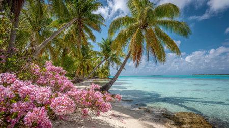 Palm trees sway gently in the breeze beside a white sandy beach. Vibrant pink flowers bloom, adding color to the idyllic scene with calm turquoise waters in the background.