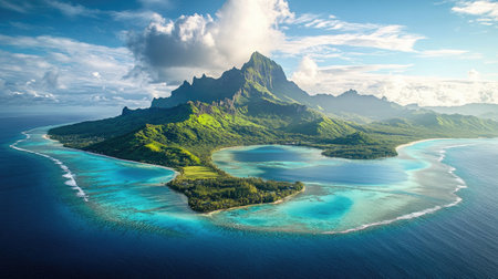 Expansive aerial shot of a lush tropical island, surrounded by a stunning turquoise lagoon and sparkling ocean waters. The image showcases the natural beauty of the island, with its lush vegetation and pristine waters.