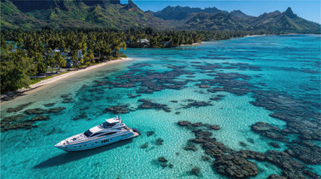 A stunning aerial view showcases a luxurious yacht anchored in a pristine turquoise lagoon surrounded by lush tropical islands and majestic mountains.