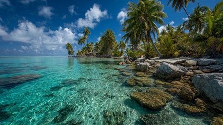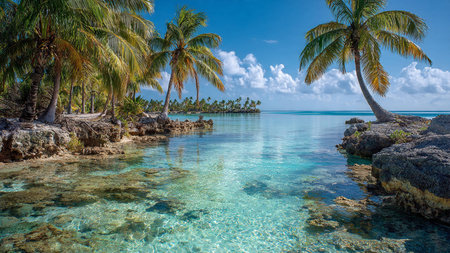 Palm trees. Beach. And crystal-clear shallow water gradually transition into deeper. Turquoise ocean waters. Creating a breathtaking tropical seascape under a bright blue sky dotted with white clouds