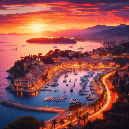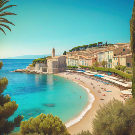 The French Riviera on a sunny day, with sparkling turquoise waters, sandy beaches, and palm-lined boulevards.
