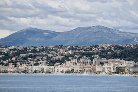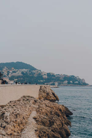 Nice, France - March 11, 2022: Coastline and Quai Rauba Capeu, an extension of the Promenade des Anglais and the Quai des Etats Unis in Nice, a famous tourist destination on the French Riviera.