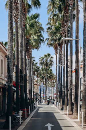 Juan-les-Pins, France - 20 May 2023: Street with palm trees in Juan les Pins, French Riviera