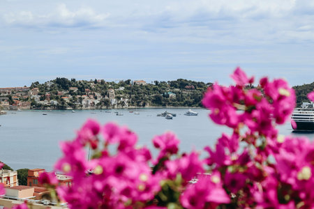 Bougainvillea out of focus in the foreground and Saint-jean-cap-Ferrat in the background