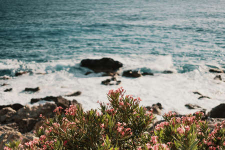 Water splashing while powerful waves crushing into the rocks in the Mediterranean sea coast with mountains on background. Nature, vacation or summer concept. High quality photo