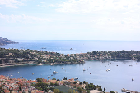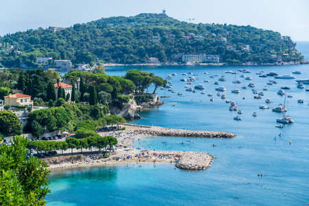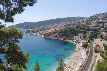 Beautiful view of the French riverira town of Villefranche sur Mer, on the coastline of the mediteranean sea, with a marina, tourist resort, France.