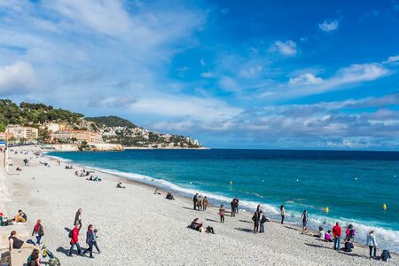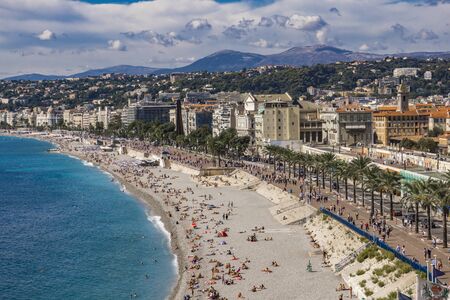 NICE, FRANCE - OCTOBER 6, 2019: Unidentified people on the beach and the Promenade des Anglais at French Riviera in Nice, France. In nie there are 15 private and 20 public beaches.