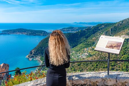 Eze, Monaco, France - October 10, 2018: Young beautiful blonde girl tourist looking towards French Riviera from the view point of Eze village in France