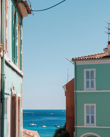 Villefranche-sur-Mer, France, Circa March, 2023: View from a boat of Villefranche-sur-Mer on a sunny day